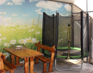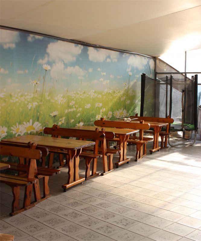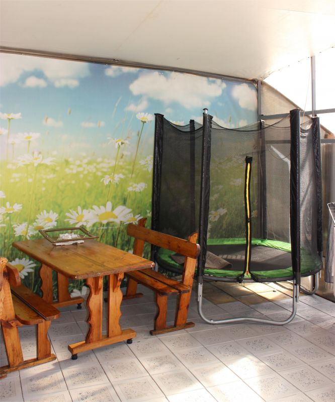 На территории дома гости могут отдохнуть в беседке, воспользоваться мангалом и приготовить любимые блюда на общей кухне. Для маленьких гостей есть батут.